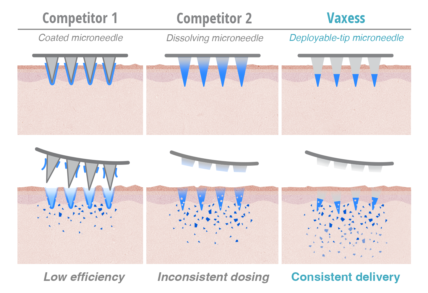 The MAP platform’s biggest strengths and primary points of differentiation are consistency and flexibility. Vaxess’s in-house GMP manufacturing accommodates variable array sizes, enabling the platform to deliver a wide range of payloads and doses. Dissolving tips delivered with an applicator allow the MAP platform to deliver doses more consistently and effectively than competition.